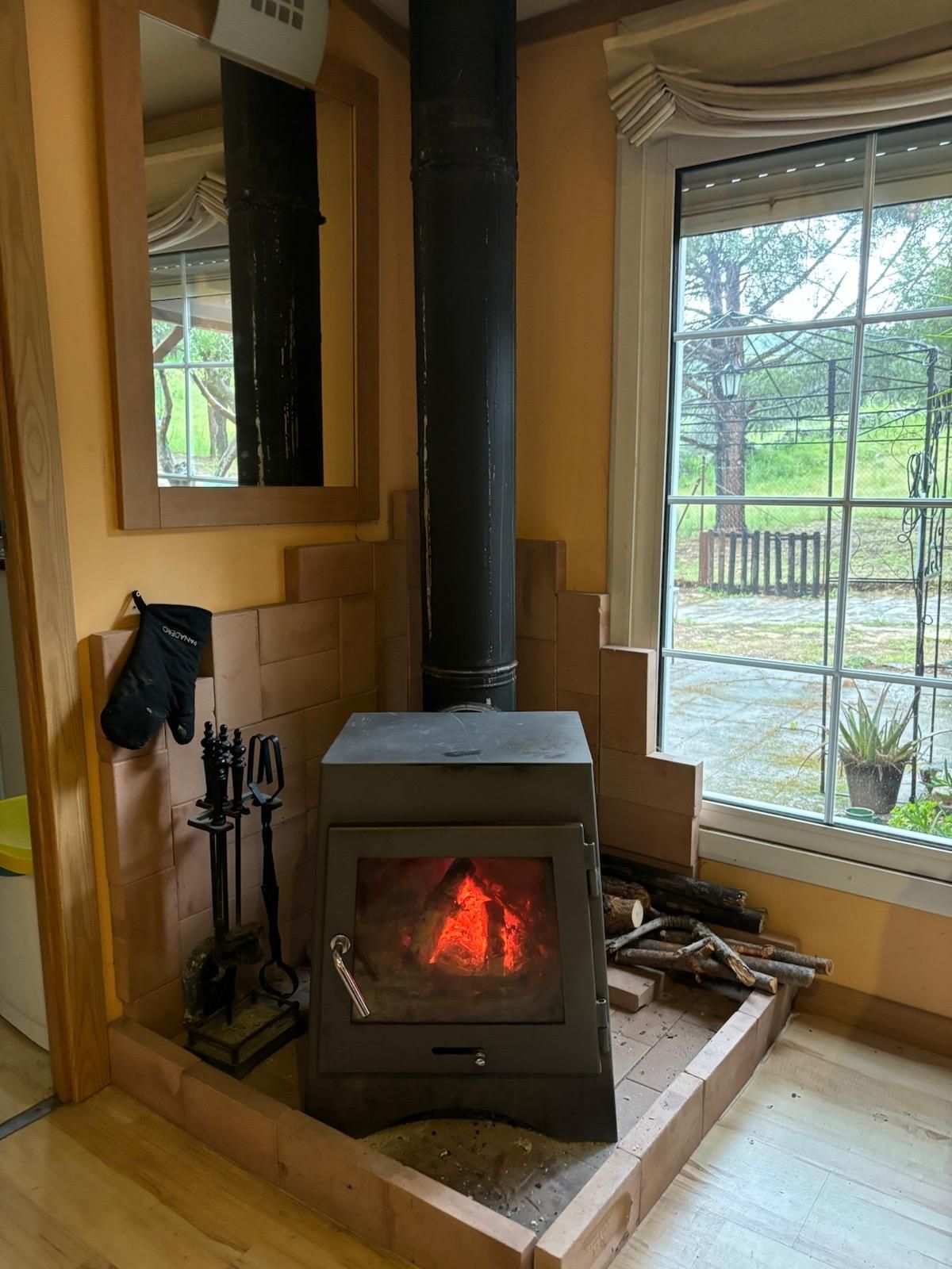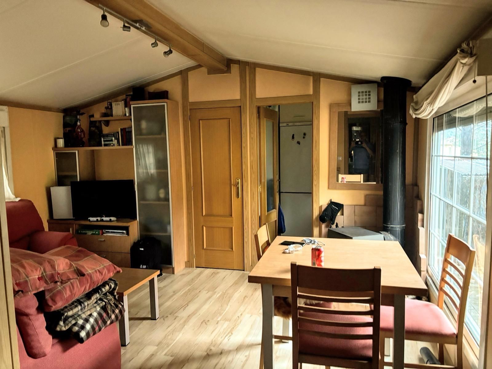 Consta de dos habitaciones, cocina independiente (frigorífico calentador eléctrico, lavadora.....), baño completo, acogedor salón con chimenea de leña, gres en baño y cocina, bomba de frío y calor, tarima c5, fabricada en panel sándwich de alta densidad y gran capacidad de aislamiento, fachada exterior con pintura pétrea. En perfecto estado.